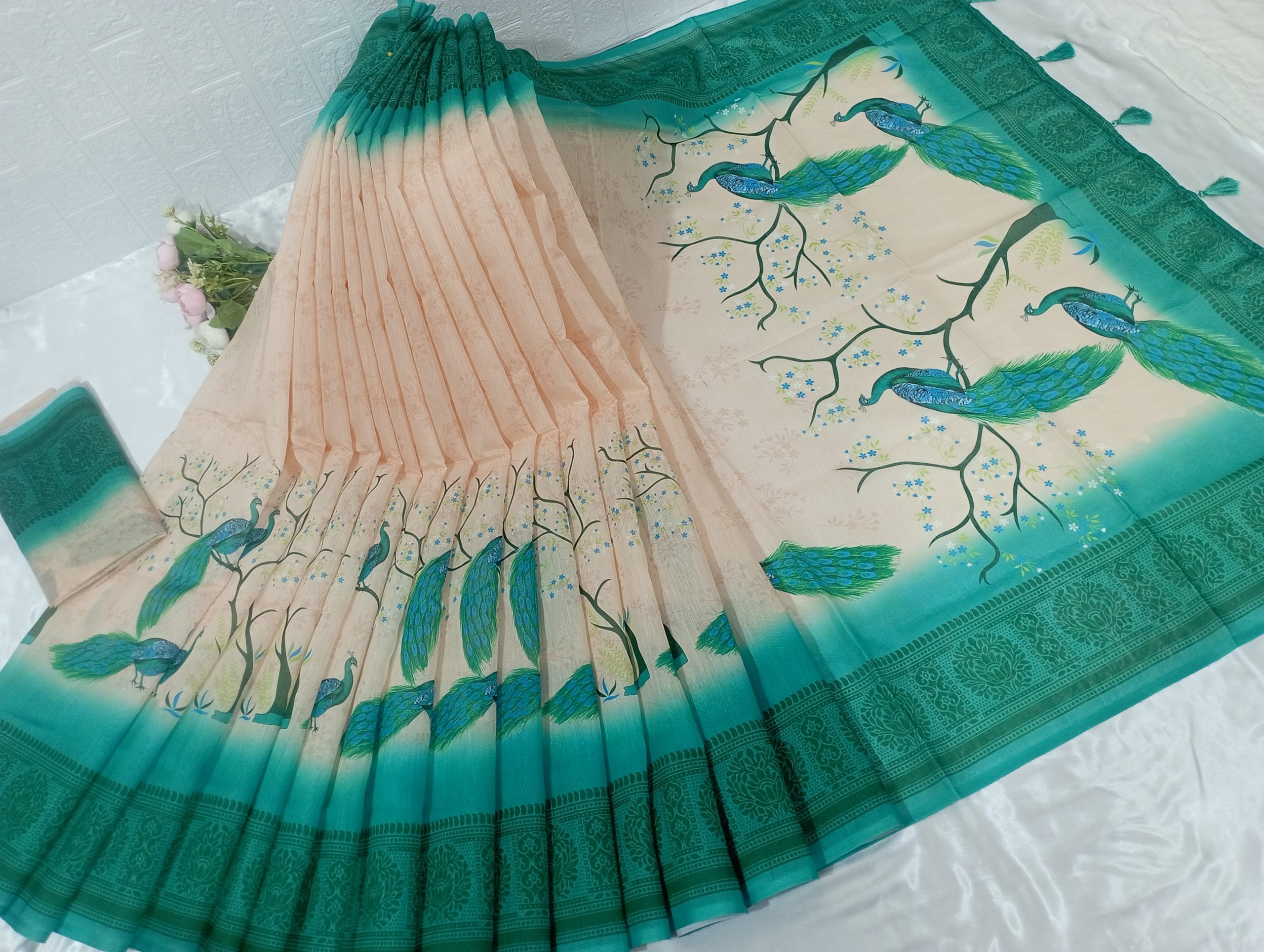 ময়ুর প্রিন্ট চান্দেরি সিল্ক শাড়ি (ব্লাউজ পিসসহ)