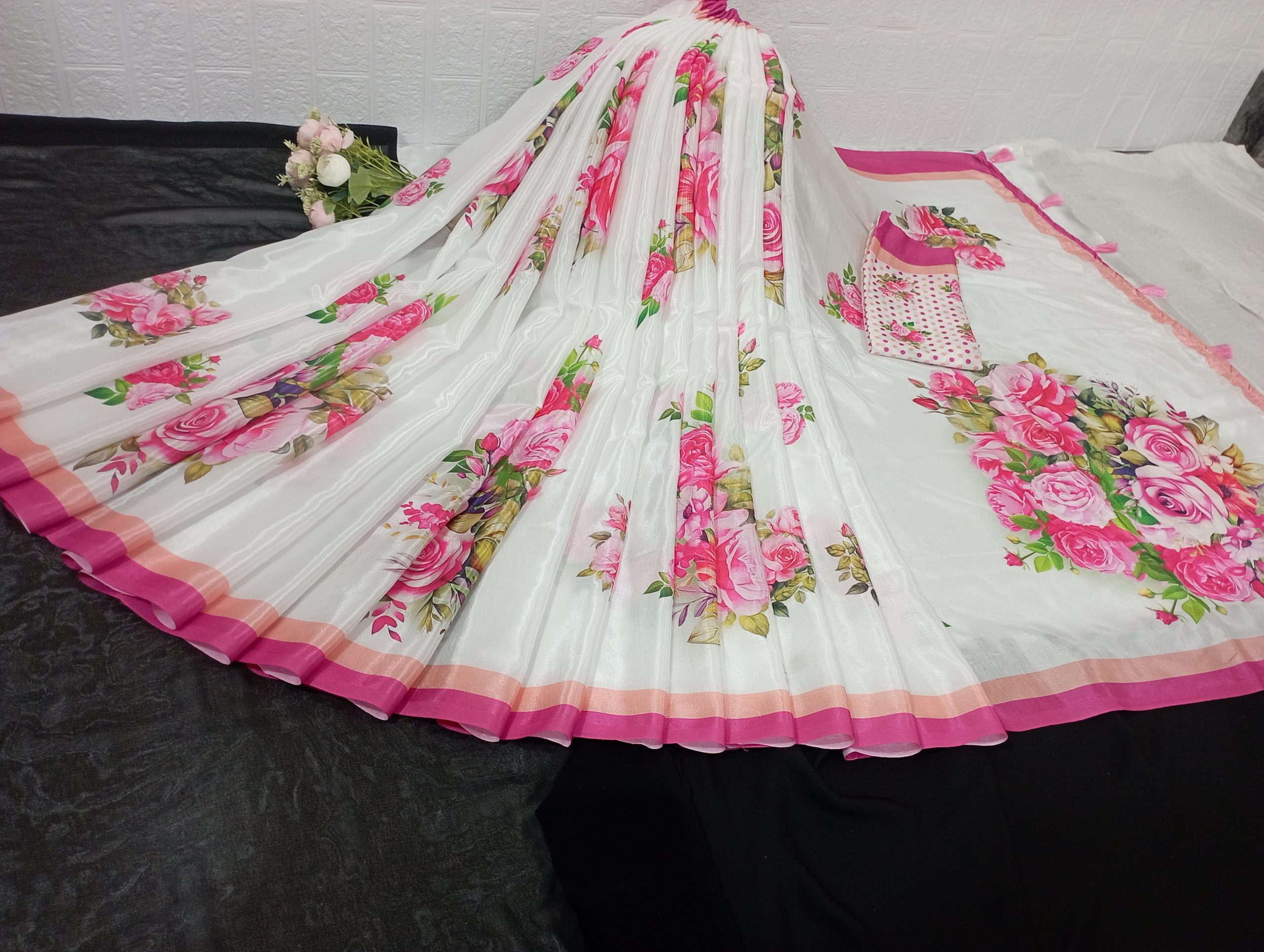 ডিজাইন: সাদা জমিনে পিঙ্ক রোজ বা গোলাপি গোলাপের আকর্ষণীয় ডিজিটাল প্রিন্ট।