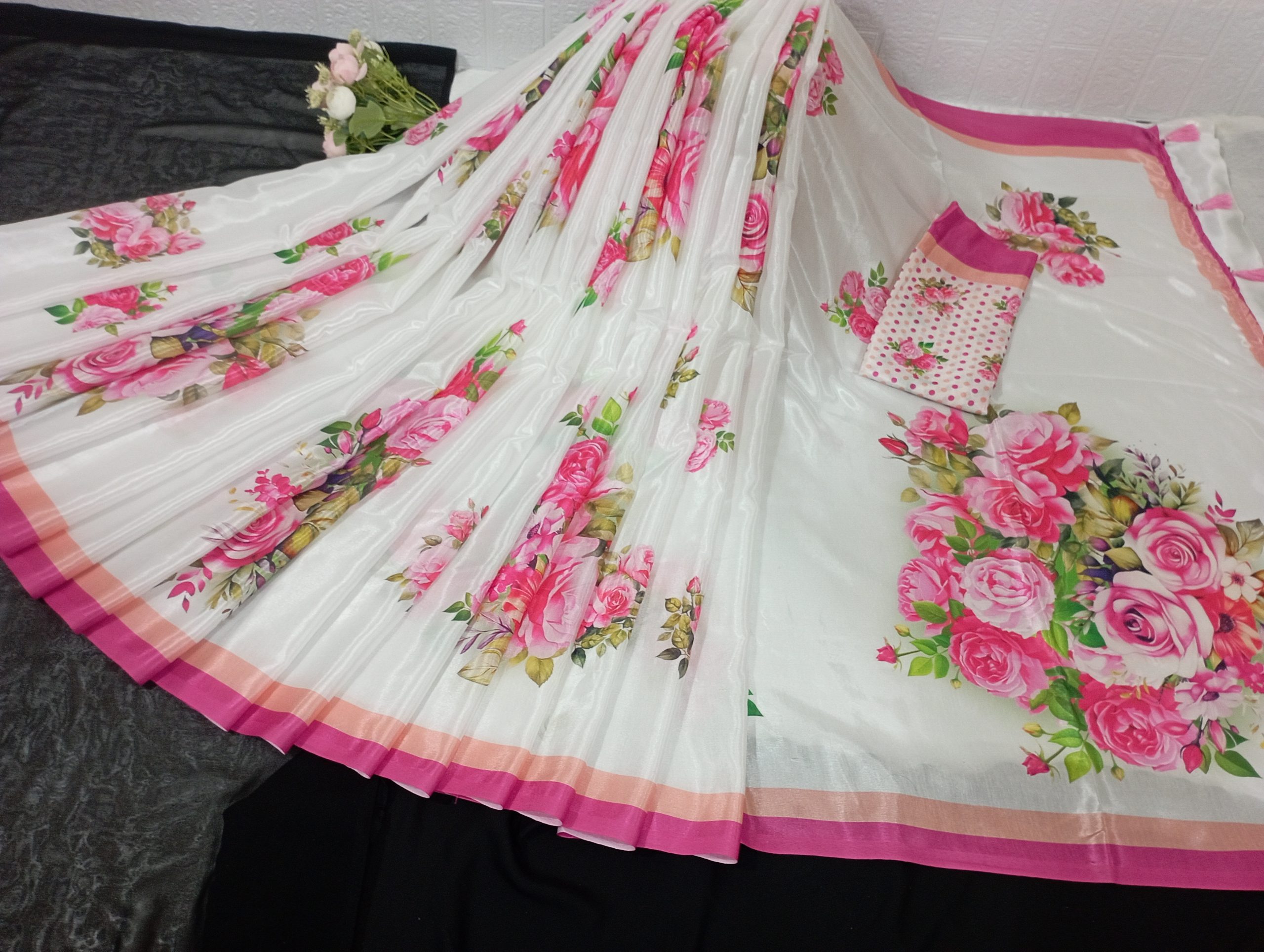 সাদা জমিনে গোলাপি গোলাপের বড় বড় তোড়া বা বোকেহ্ (Bouquet) প্রিন্ট করা এই চান্দেরি সিল্ক (Chanderi Silk) শাড়িটি আপনার রুচিশীলতার পরিচয় দেবে। শাড়িটির প্রিমিয়াম ফেব্রিক এবং উজ্জ্বল গোলাপি পাড় একে দিয়েছে এক আভিজাত্যপূর্ণ লুক। এটি ১২ হাত লম্বা এবং এর সাথে ম্যাচিং পোলকা ডট ডিজাইনের একটি ব্লাউজ পিস রয়েছে, যা শাড়িটির সৌন্দর্য আরও বাড়িয়ে তোলে।